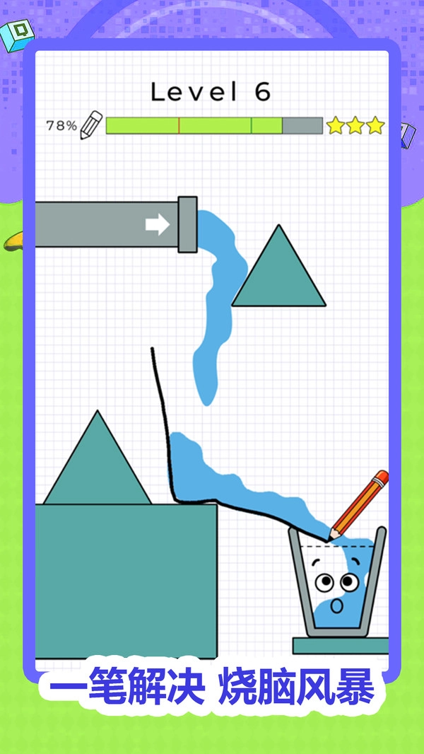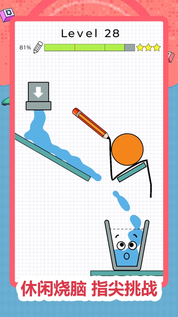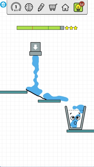 1、进入关卡后,首先观察整个场景布局:液体从哪里流出?杯子在哪里?中间有什么障碍?然后,用手指在屏幕上从液体源头开始。 2、画线完成后,点击“开始”按钮,液体会从源头流出,并沿着你绘制的路径移动。你需要观察液体是否能完全、顺畅地流进杯子。 3、每个关卡设有“三星”评价,通常与“使用墨水最少”(线条最短)或“用时最短”相关。在满足基本通关后,可以反复挑战以达成三星。
