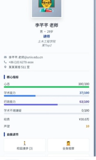 3.进入游戏主界面后,通过档案页不仅能查阅个人的详细信息,还能进行多种自我调节操作。比如开启校园漫步模式放松身心、选择全身按摩缓解压力,或是投入到论文修改中提升专业能力。