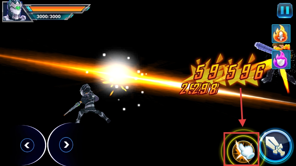 4、当敌人血量合适时,点击技能按钮释放技能,触发华丽特效,单次技能可造成【59】-【596】-【2998】等高额伤害,快速击溃敌人。