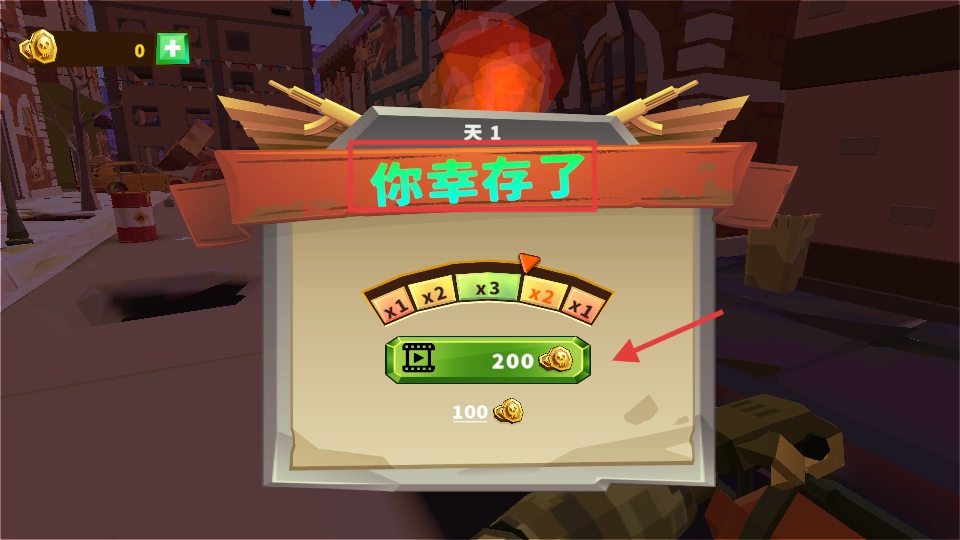完成【天1】关卡可获得【100】金币,观看视频还能额外获取【200】金币,这些金币可用于武器升级,为后续战斗做准备。