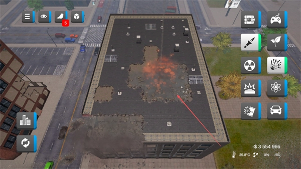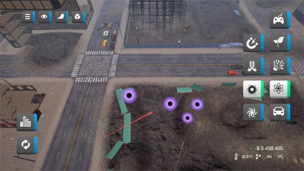 从右侧选择黑洞、核爆等灾害类工具,在城市区域进行释放,以此制造出破坏效果。