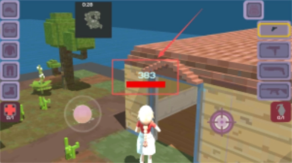 进入木屋场景后,点击右侧的紫色手枪图标来装备武器,轻触屏幕上的任意位置就能进行射击。