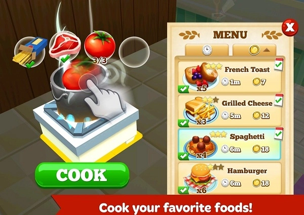 本作的玩法简单易懂,和其他模拟经营类游戏类似,玩家只需按照提示点击操作来制作美食。每道美食的制作都需要花费一定时间,等美食制作完成后,将其端上桌供客人享用就可以了。