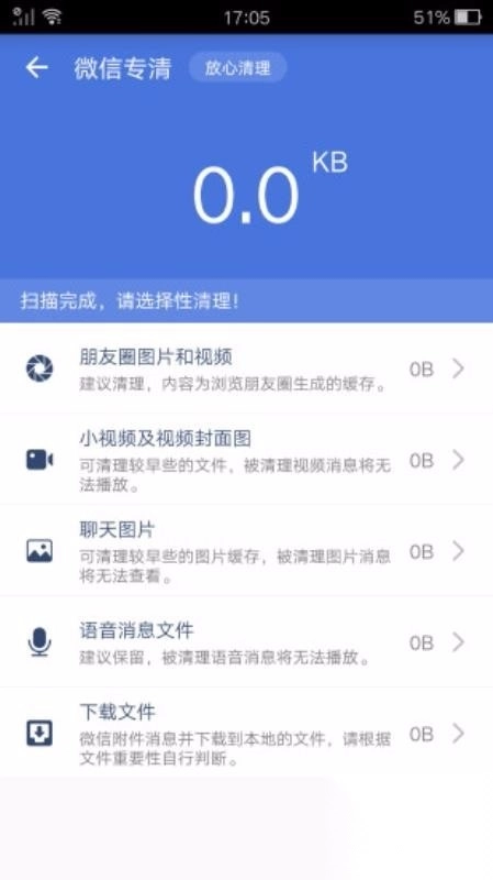 微信专清,对微信的聊天文件、图片、语音消息、视频等等进行选择性清理;