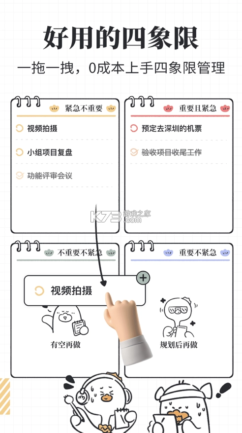 【超好用的四象限】觉得四象限时间管理太过复杂?别担心,这里有零学习成本、上手即能高效管理时间的方法!只需长按计划进行拖拽,就能轻松完成事务轻重缓急的设置。