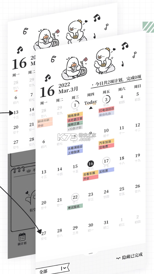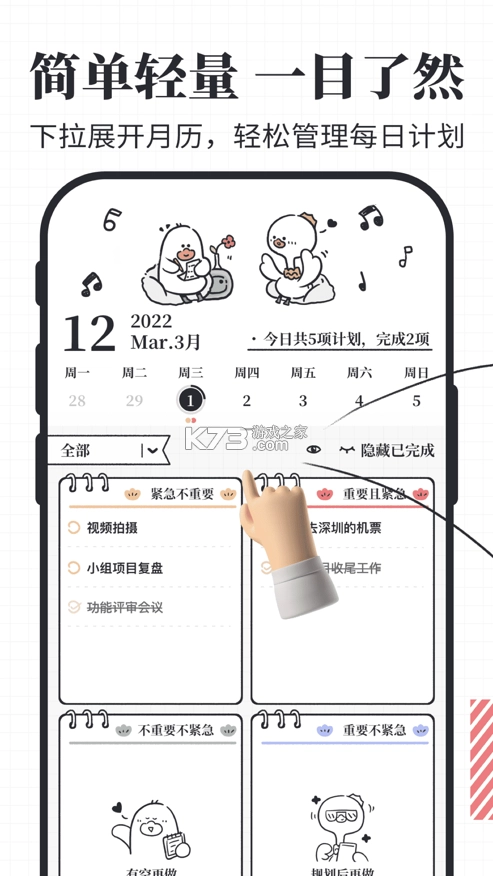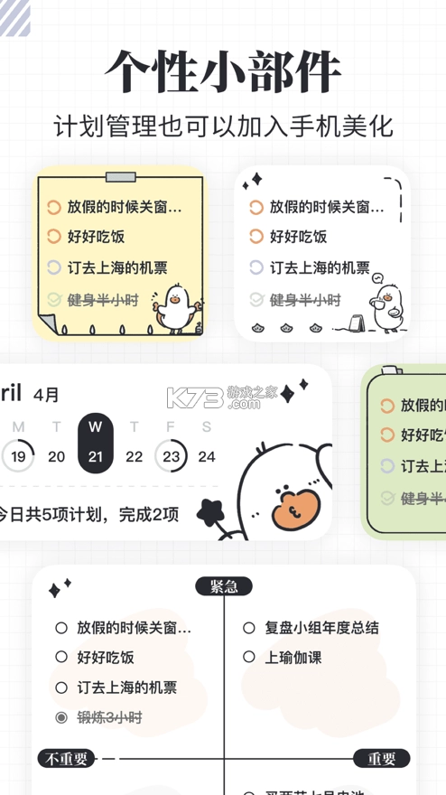 宣传文本:四象限日历日程,待办任务一拖一拽,轻松实现计划管理!从此告别手忙脚乱,提升生活品质!【做计划,原来可以这么有趣!】 应用描述:“我要做计划”,这是一款专注于记录待办事项、合理分配任务轻重缓急以及高效管理日程的效率类应用。生活中,你是否常常因处理琐碎的临时事务,而遗漏重要事项?当你想要做计划、记录事情时,是不是又觉得多数 APP 操作过于复杂,添加事件后难以找寻与管理?别担心,在这里,胖咕噜和天鹅姐姐将陪伴你完成每日计划安排与事项记录,见证你的生活点滴与成长历程。它不仅是帮你将生活打理得井井有条的得力助手,更是一本记录你生活的专属笔记本。