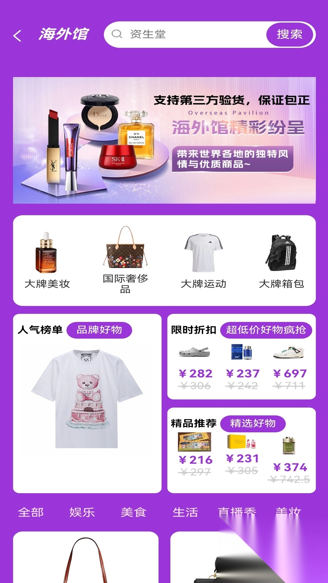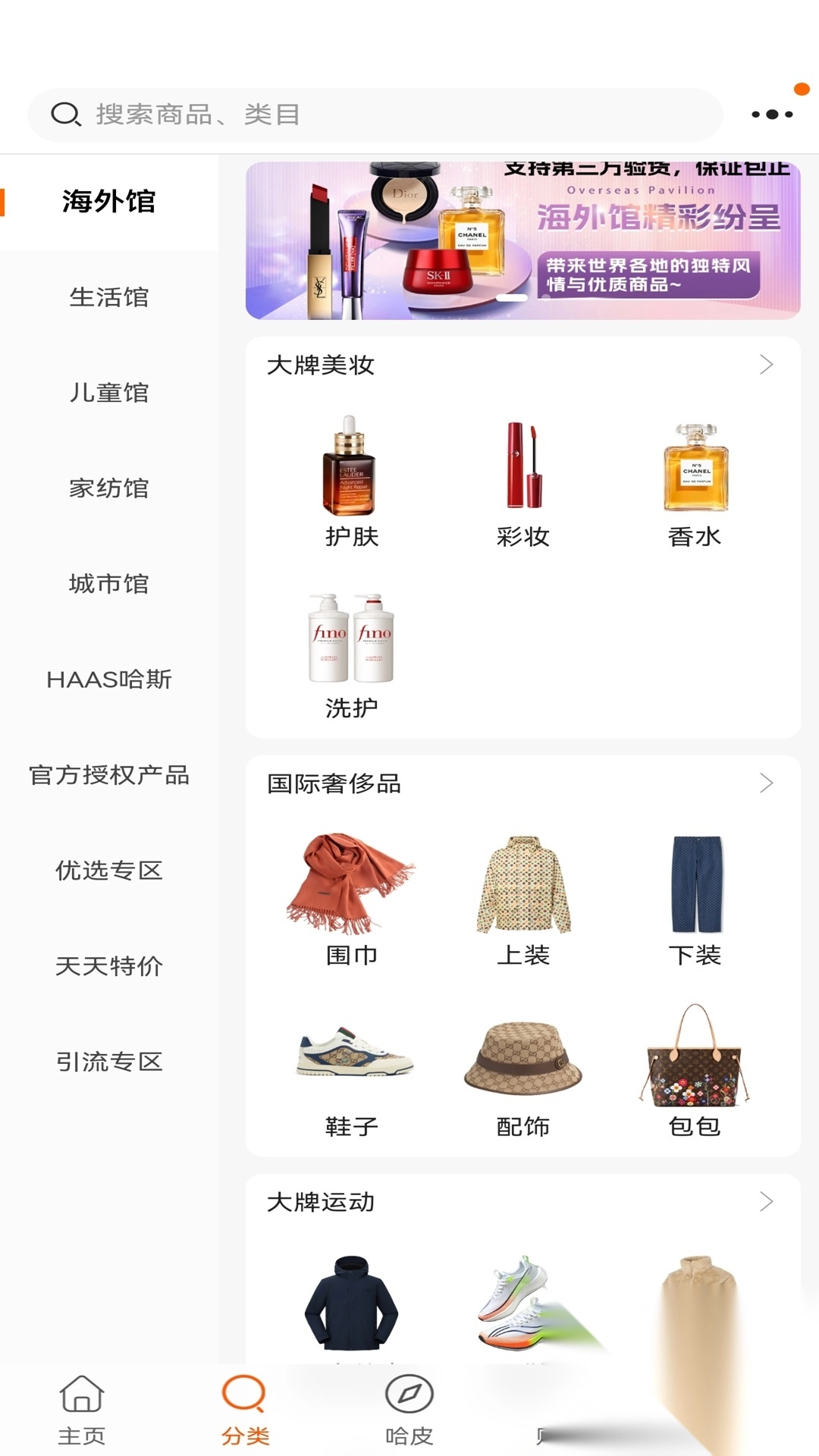 2、在海外馆中有大牌美妆、国际奢侈品、大牌运动以及大牌箱包等;
