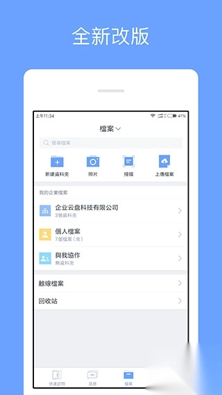 360企业网盘手机版,这是专门面向企业用户打造的一款云存储服务产品,通常也被叫做360安全云盘企业版app、亿方云企业云盘app 。当下,该软件为用户配备了诸多实用功能,涵盖文件安全存储、自动备份、多端同步、文件共享、文件权限管理、企业成员用户管理,还支持分享、搜索以及清理重复文件等。不管是照片、音乐、视频、应用程序,亦或是通讯录与短信等内容,都能够一键备份至云盘之中。即便用户不慎丢失手机,所存储的数据依然能够在云盘中找回,着实方便又实用。