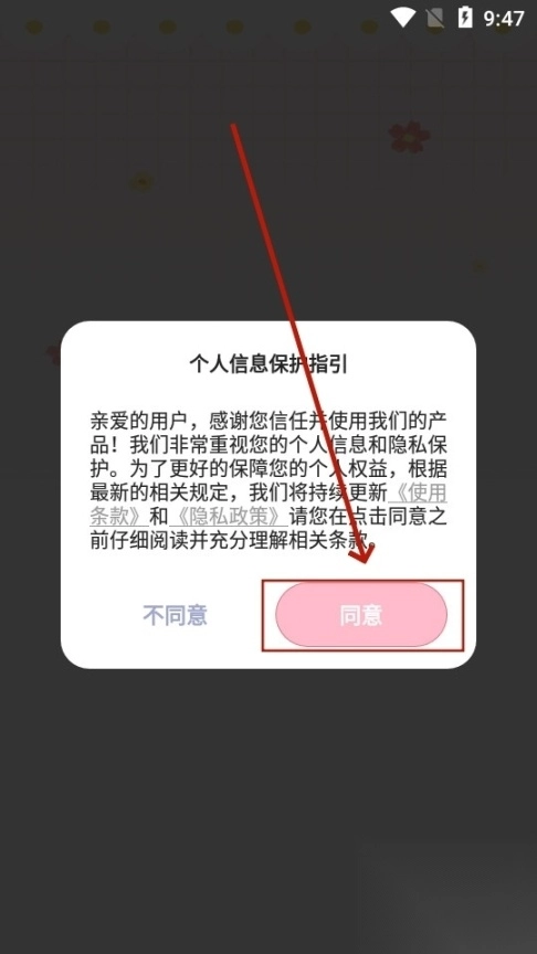 ,安装完成后打开该应用。进入应用界面后,点击“同意”选项,以表示同意隐私政策。