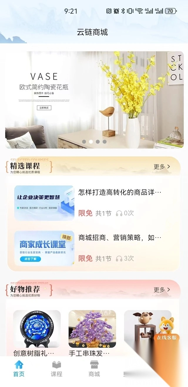 1、首页设有精选课程和好物推荐两大板块,商家能够随时便捷、高效地学习各类课程。