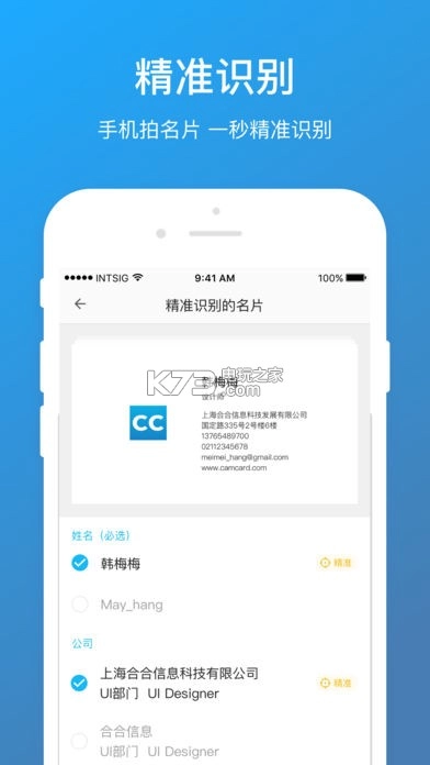 使用名片全能王,只需用手机拍照,即可自动扫描名片,精准识别上面的信息,并迅速保存至手机通讯录。