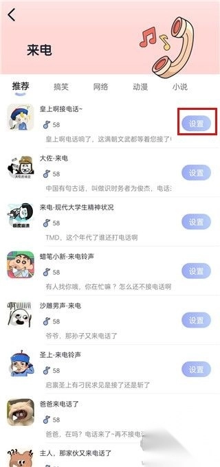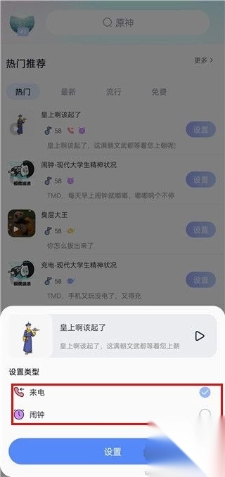3、挑选需要设置的铃声类型,确认之后再次点击 “设置” 就能完成。