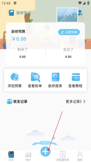 2、进入首页,点击【+】图标,选择【装修记账】。