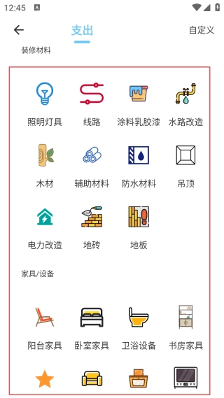 1. 预先设定涵盖全面的装修费用类别,能够精准对应各类支出。此外,还支持自行定义并新增类别,以契合个性化的记账需求。
