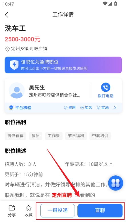 3、详情页面有一键投递,也可以点击直聊,跟hr沟通了解岗位信息