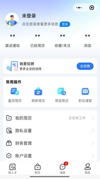 2、界面与操作:采用用户友好型设计,界面简洁直观,求职和招聘功能区域划分明确,即使是新手也能迅速熟悉并操作。