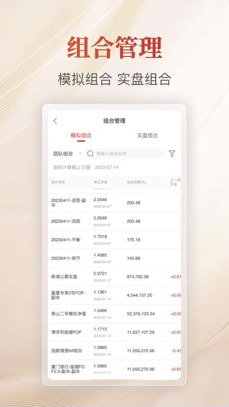 在此,你能够对所需基金产品进行实时组合管理,一键开启实盘组合,还能轻松创建模拟组合。