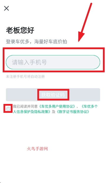当跳转至登录界面,在相应位置输入手机号,同时勾选《车优多用户使用协议》、《车优多个人信息保护及隐私政策》以及《数字证书服务协议》,表明已阅读并同意这些协议,随后点击获取验证码完成登录操作。若该手机号尚未注册,系统将自动为其进行注册。