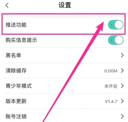 3、打开设置界面,依据下图箭头所指方向,点击开启【推送功能】就可以了。