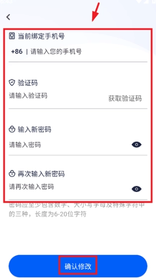输入当前绑定手机号,验证码,新密码,点击确认修改即可。