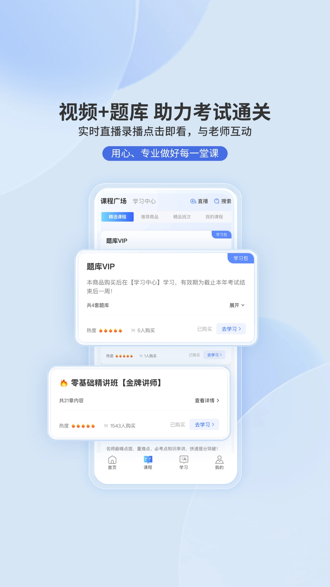 资深老师为您制定合理学习计划,通过实时直播互动学习的方式,在别具一格的直播间班集体中,有针对性地强化您考试的薄弱环节。