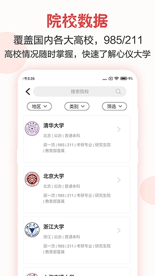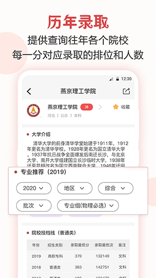 2、依据学生分数,推荐冲刺、稳妥、保底等不同梯度的院校。同时,深入分析高校历年录取情况,全面提供各校优势学科、历年招生数据以及高校硕博点等相关信息。