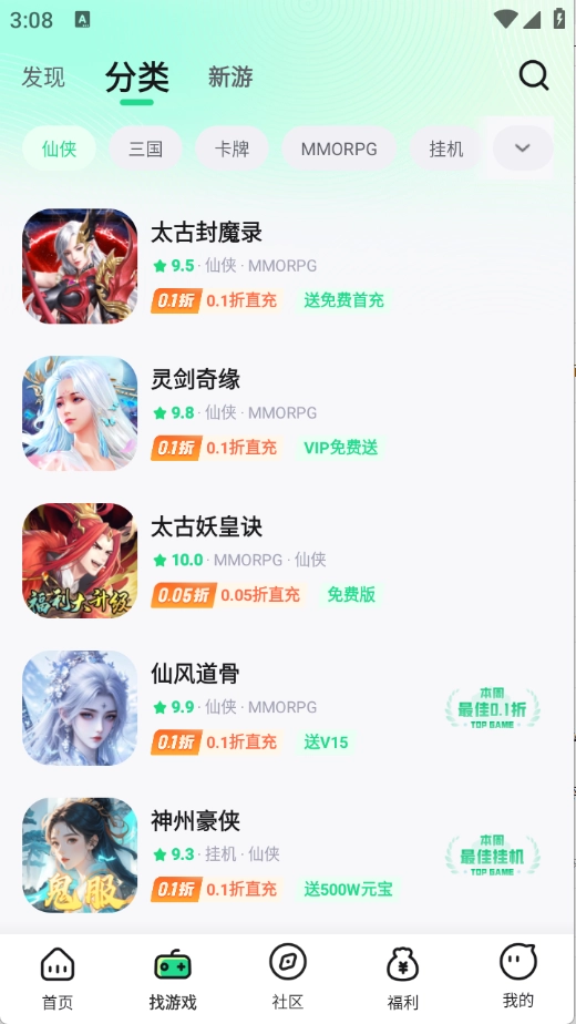 3. 在“找游戏”页面,游戏被进行了细致的归类,涵盖三国、传奇以及卡牌等多种类型。
