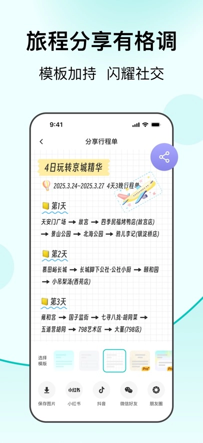 超精美行程模板来袭:旅程画上句号后,只需一键,即可生成专属于你的旅行故事!无论是路线地图,还是文字行程,都有各式各样的精美模板供你挑选,让你轻轻松松打造出高颜值的旅行日志。