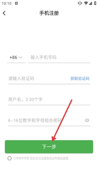 3、在手机注册页,填手机号、验证码、用户名、密码,勾选协议后点【下一步】完成注册。