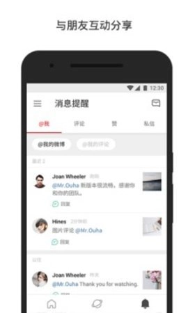 1、新浪微博轻享版提供的私信和评论功能十分简便,为你与心仪之人搭建起沟通的桥梁,是个相当出色的社交平台。