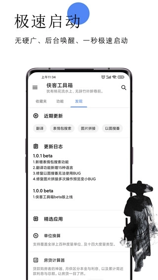 侠客工具箱app官方最新版本,堪称一款极为优秀的多功能手机工具箱。它集合了多达上百个小工具,涵盖日常小工具、查询工具、计算工具、表情包、打字板、画板、以图搜图、单位换算、图片处理、视频处理、音频处理以及文字工具等各类工具。重点是,这里所有工具统统免费使用,有需求的朋友们可千万别错过啦。