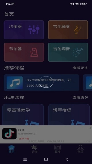 2、首页推送具备丰富功能,涵盖均衡器、吉他弹奏、节拍器以及吉他调音等。