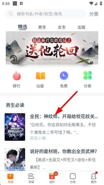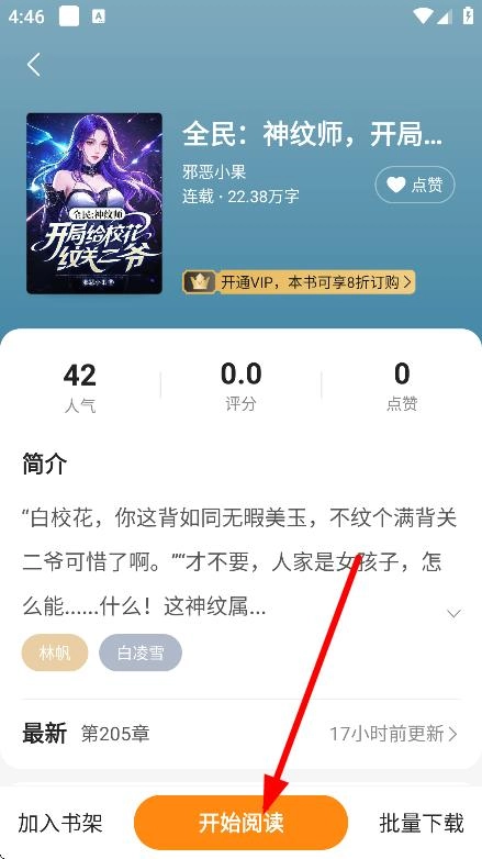 1. 在书城界面,点击《全民:神纹师,开局给校花》,进入该书的详情页面。