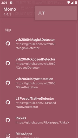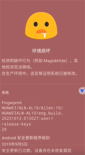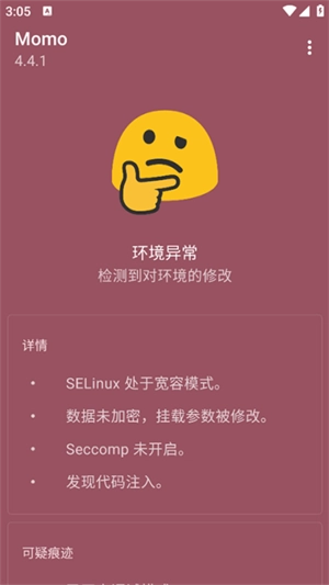2、开启momo环境检测软件后,系统提示环境存在问题,检测到面具的隐藏root模块。