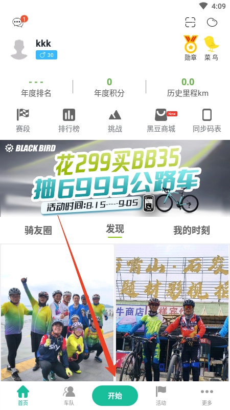 1. 开启黑鸟单车应用,轻点下方的【开始】按钮。