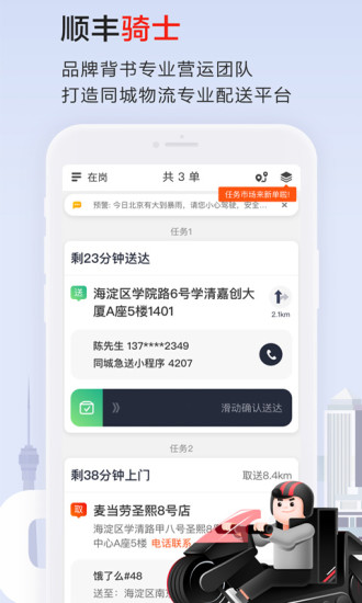 2、顺丰同城骑士,是专为顺丰同城配送员量身打造的得力赚钱助手。