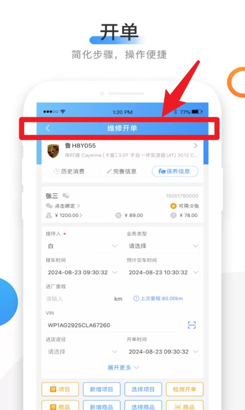 2. 轻点顶部的“维修开单”模块,依次填入客户信息、维修项目以及时间,即可迅速完成开单流程的相关操作。