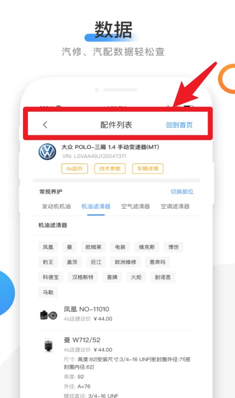 4、轻点“配件列表”,就能查询与车型匹配的配件数据,同时还支持依据分类浏览常规养护、过滤器等相关内容。