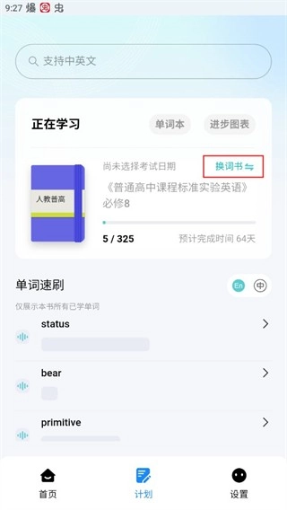 4、用户成功完成词库学习后,便可前往计划栏,选择更换词书,以学习更多内容。