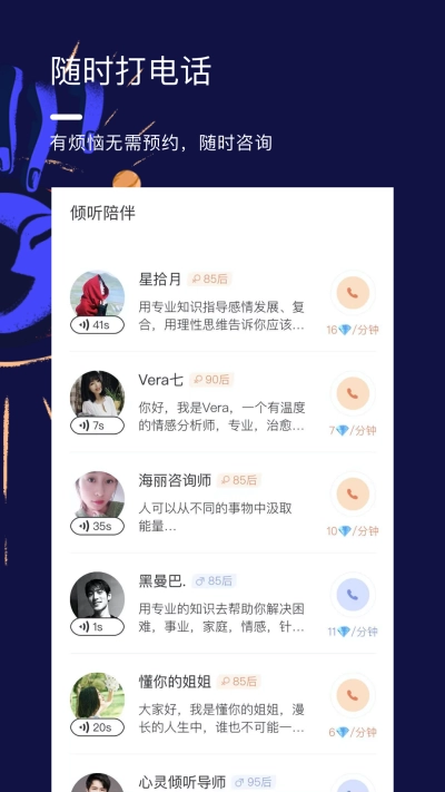 2. 同时,也有心理咨询师在线,为用户解答情感方面的疑惑,处理各类问题。