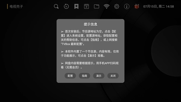 3. 在弹出的窗口里,点击源地址,输入影视源配置(此操作需获取存储权限)