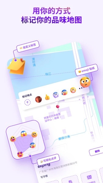 【个性化标记】 不再是单一的地图标记,可以用各种好玩的 emoji、自定义地点标签和可视化点评标记地点。