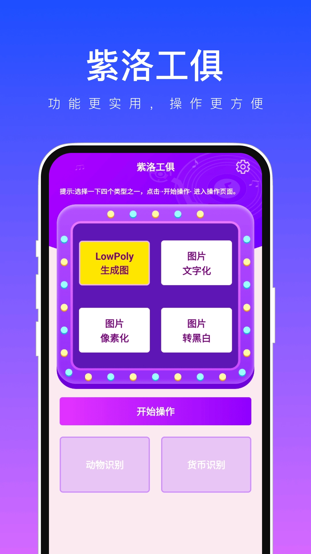 紫洛工具是一款功能极为强大的实用软件。这款软件界面简洁,体积轻盈小巧,内部蕴含着丰富多样的功能,像生成图片、图片文字化、图片像素化以及图片转黑白等功能一应俱全。用户能够依据自身实际需求自主使用这些功能,从而满足不同用户的多样化需求。该软件将多种功能集合于一身,给用户的生活带来诸多便利,而且还配备专业的P图工具,大大提升了用户P图的效率。有需要的朋友们,赶紧来使用吧!