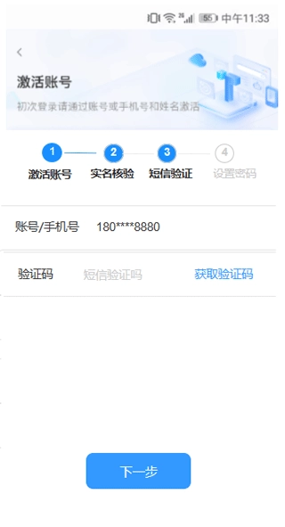 通过输入账号或手机号以及姓名来验证账号是否已激活。若账号已激活,可直接进入登录页面;若账号未激活,则点击“下一步”。
