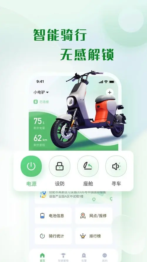 4、取代钥匙:骑行者可以使用绑定车辆后,手机蓝牙无感开锁、控制车锁、上电、寻车,可以有效取代车钥匙,方便用户出行。