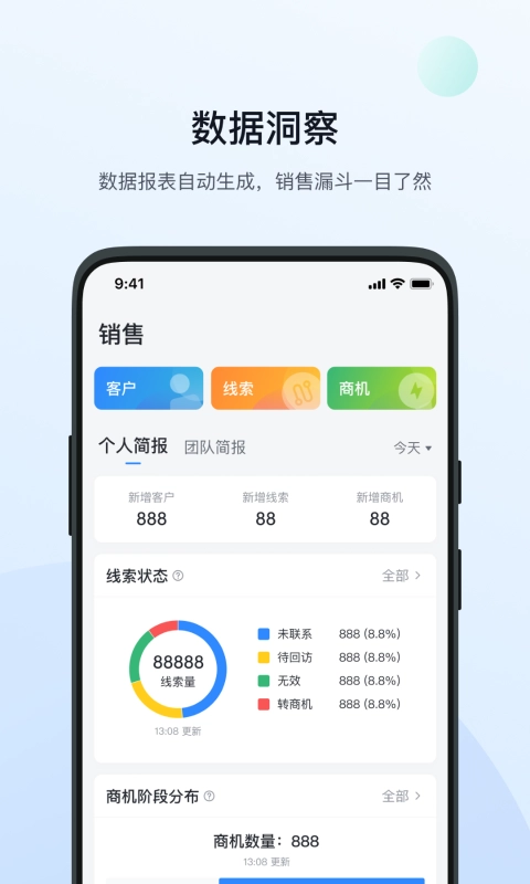 提供线索、商机以及客户管理支持,能够自行定制销售跟进流程,达成全链路的销售流程管理。