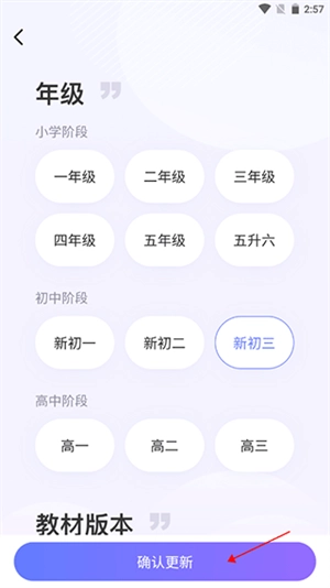 2、进入界面之后,点击年级与教材版本,挑选你想要更改的年级,随后点击确认更新就可以了。