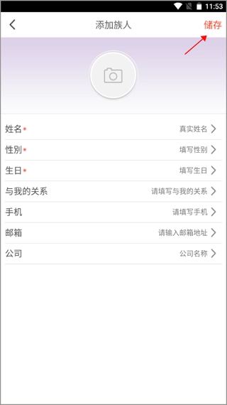 3、录入族人自身基本信息以及与用户的关系,填写完毕后,即可点击右上角的“储存”按钮,如此便完成了族人的添加。