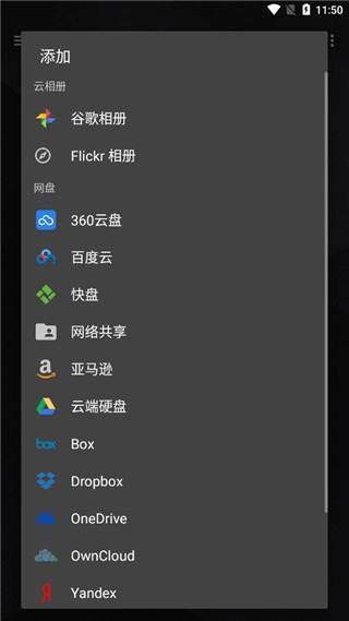 8、免费精选图片来源丰富,包含500px、Flickr趣图、Flickr相册以及谷歌相册。同时支持添加多种网盘,如局域网网络共享,还有亚马逊、云端硬盘、Box、Dropbox、OneDrive、OwnCloud等等。