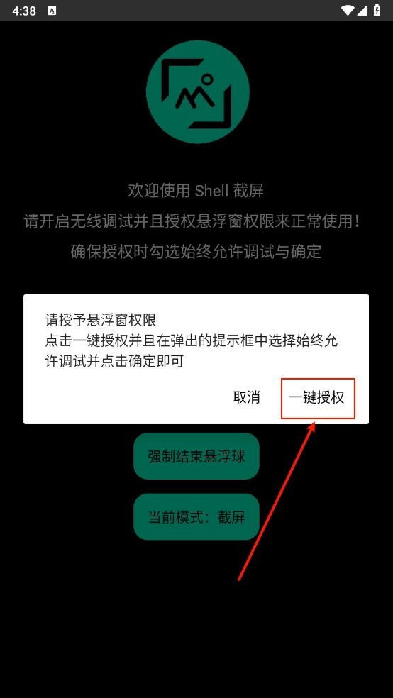 1. 安装Shell截屏,进入后点击“一键授权”。